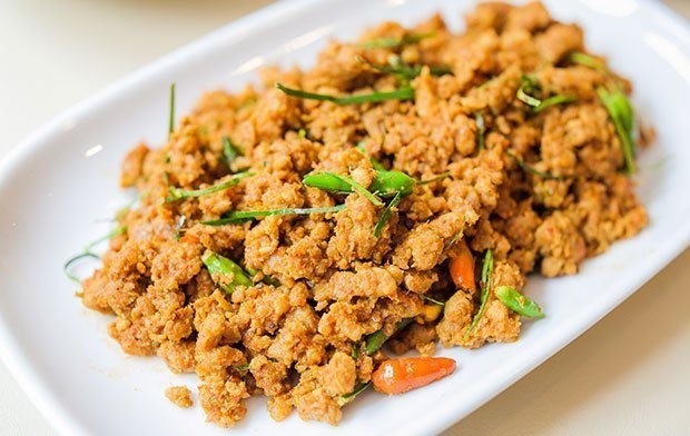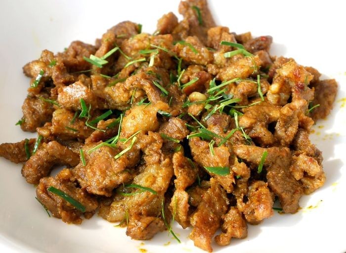 3. นำกระทะตั้งไฟอ่อน ใส่เนื้อลงผัดจนเนื้อแห้ง ใส่น้ำพริกแกงที่โขลก ใส่น้ำปลาลงผัดจนเข้ากันดี โรยใบมะกรูด พริกชี้ฟ้า พริกขี้หนู ตักใส่ภาชนะ เสิร์ฟพร้อมผักเหนาะ