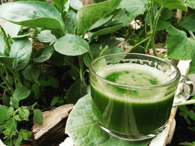 - ล้างใบคะน้าให้สะอาดแล้วนำมาหั่น จากนั้นใส่เครื่องปั่น เติมน้ำครึ่งหนึ่ง ปั่นจนละเอียดแล้วนำมากรอง