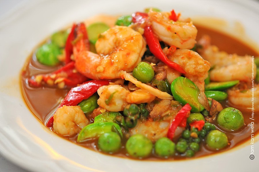 3. ใส่สะตอ พริกชี้ฟ้า พริกหวาน ผัดให้เข้ากันแล้วใส่กุ้ง พอกุ้งสุกตักใส่ภาชนะ