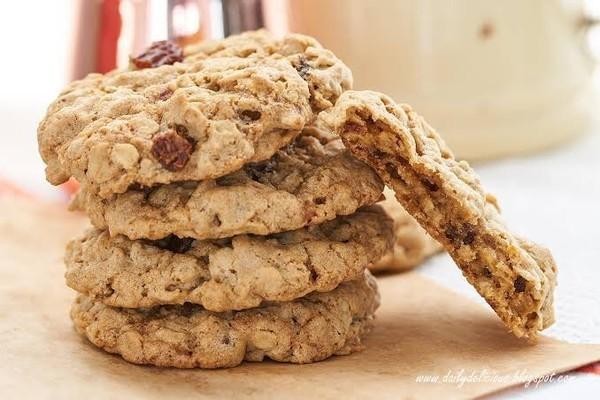 - เติมส่วนผสมของแป้งที่ร่อนไว้ลงไป ดีด้วยความเร็วต่ำพอให้เข้ากัน ใส่ข้าวโอ๊ต และลูกเกดสับลงไป ผสมพอเข้ากัน