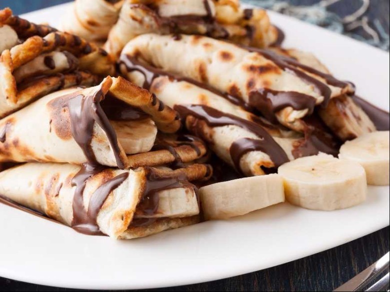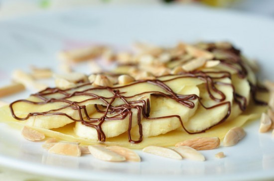 - ใช้ทิชชูทาเนยในกระทะ ตักแป้งเครป 1 ทัพพี ใส่ในกระทะ กลอกแป้งให้ทั่วบนไฟกลาง พลิกกลับจนสุก ตักใส่จาน เสิร์ฟพร้อมกล้วย เม็ดอัลม่อน และช๊อกโกแลต