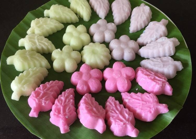 - ตักขนมอัดลงในพิมพ์ที่โรยด้วยแป้งมันไว้ก่อนแล้ว จึงเคาะขนมจากพิมพ์ใส่ถาด