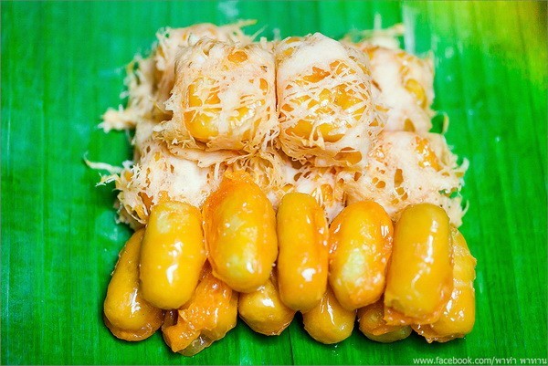 - นำถั่วทองที่ปั้นแล้ว จุ่มลงในไข่แดง แล้วใส่ลงในน้ำเชื่อม พอไข่สุกตักขึ้น คล้ายการทำขนมเม็ดขนุน