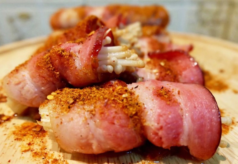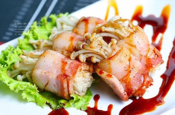 7. เบคอนพันเห็ดเข็มทอง พร้อมเสิร์ฟ ราดด้วยซอสต่างๆ ตามชอบ รับประทานกับสลัดต่างๆ ยิ่งอร่อยเข้ากัน