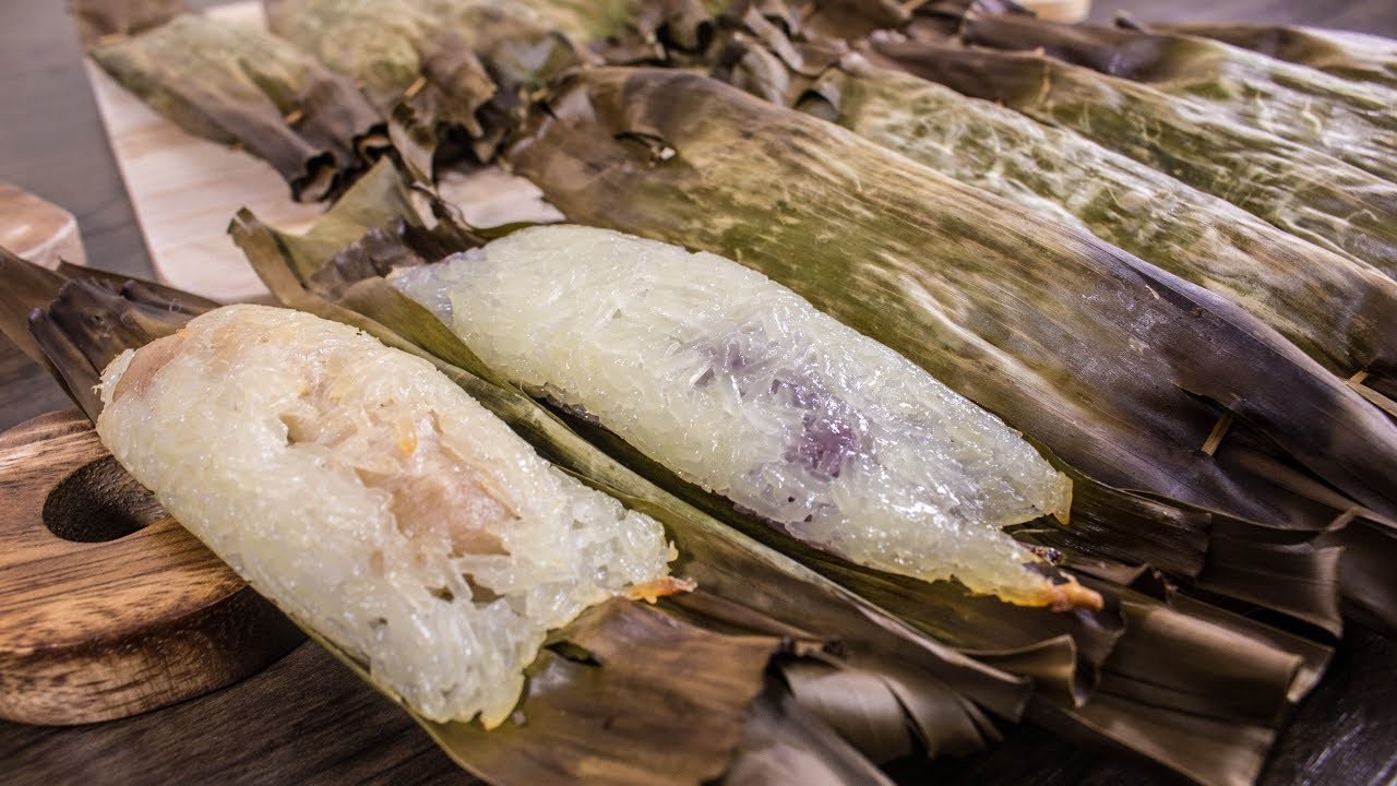 - นำใบตองที่ตัดไว้มาพับเป็นกรวยแหลม ใส่ข้าวเหนียวลงไปเล็กน้อย ใส่กล้วย 1 ชิ้น ( หรือ เผือกกวนประมาณ 1 ช้อนโต๊ะ ) ใส่ข้าวเหนียวทับลงบางๆ พับใบตองปิดกลัดด้วยไม้กลัด ปิ้งไฟอ่อนให้ข้าวเหนียวมีสีเหลือง รับประทานร้อนๆ