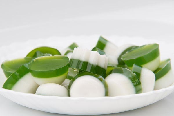 - ตักส่วนผสมข้อ 2. ใส่ลงในถาดวุ้นขณะที่ร้อนๆ วุ้นจะได้เกาะกัน ปล่อยให้เย็น แล้วจึงตัดเป็นชิ้น