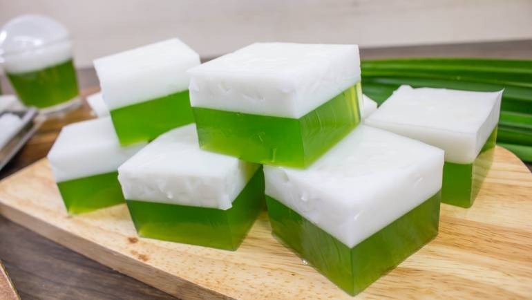 - ผสมวุ้นผงกับน้ำลอยดอกมะลิ เข้าด้วยกัน ตั้งไฟกลางค่อนข้างอ่อน หมั่นคน พอเดือดใส่น้ำตาลทราย คนให้น้ำตาลละลาย ใส่น้ำใบเตย เดือดอีกครั้ง ยกลง เทใส่ถาดขนาด 8x8 นิ้วจะได้ 4 ถาด ปล่อยให้เย็น