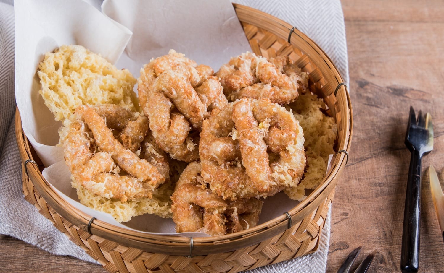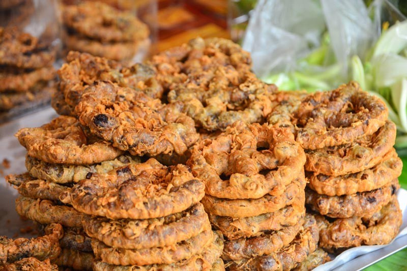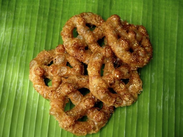 - ตั้งกะทะ ใช้น้ำมันมากๆ ไฟกลาง พอน้ำมันร้อนหยิบขนมที่ปั้นไว้ลงชุบแป้งทีละอัน ใส่ในกะทะอย่าให้มากนัก พอเหลืองตักขึ้นชับน้ำมันบนกระดาษฟาง พอเย็นเก็บใส่ขวดโหลไว้รับประทาน
