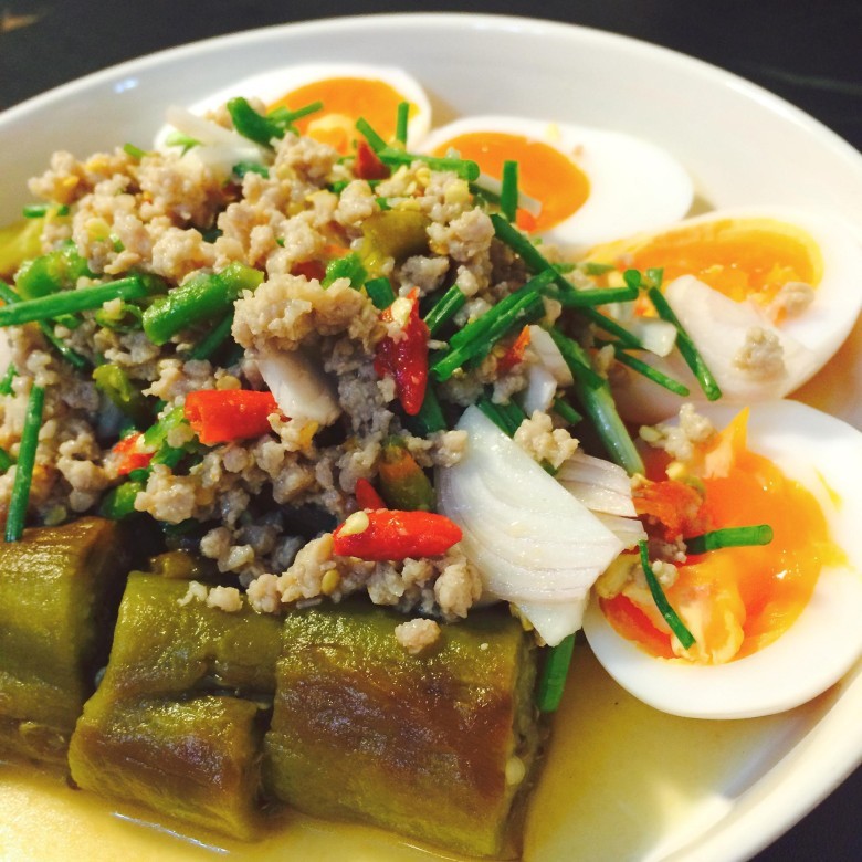 4. นำมะเขือยาวที่เผาเรียง ใส่หมูสับ หอมแดงซอย ราดน้ำยำ โรยผักชี หอมซอย เป็นอันเสร็จคะ