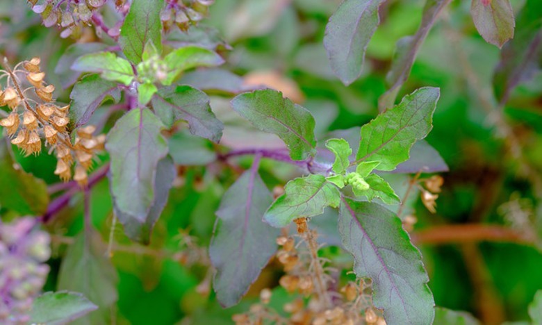 - ล้างใบกะเพราแดงให้สะอาดแล้วนำไปตากแดด 2-3 แดด จนแห้งจึงเก็บไว้ในกระป๋อง
