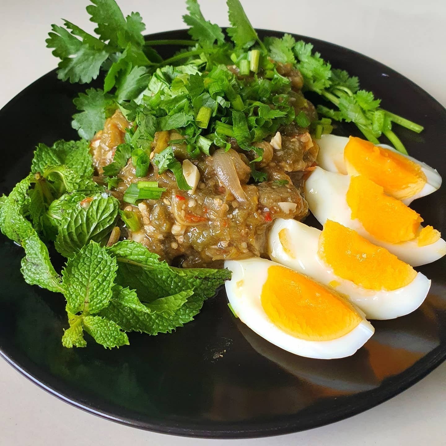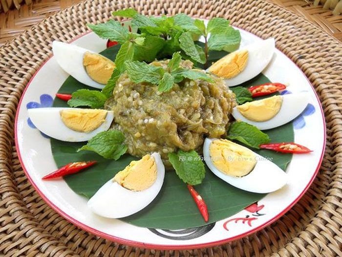 5 ตักใส่จานโรยด้วยใบสะระแหน่ ใบแมงลัก และไข่ต้มหั่นเป็นซีก