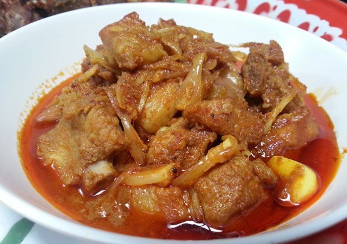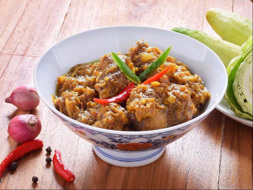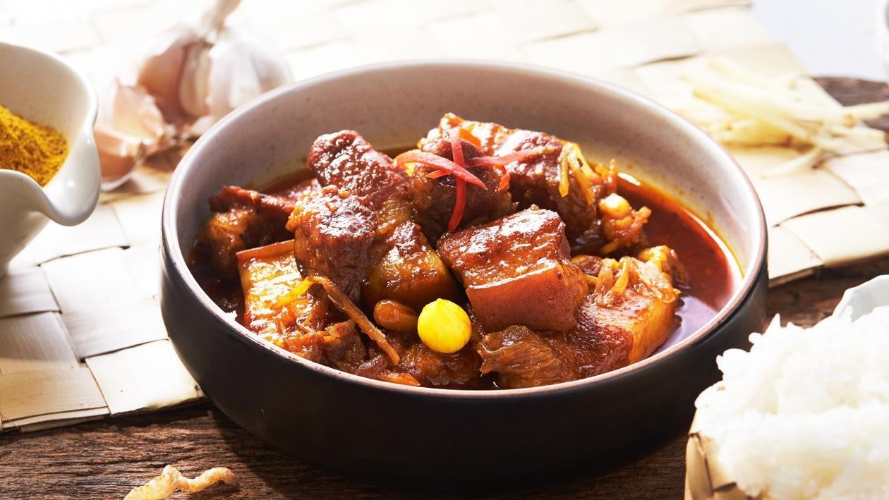 4. ใส่ขิง กระเทียมแกะเป็นกลีบๆ ผงกะหรี่ เคี่ยวต่อจนหมูนุ่มและน้ำแกงเริ่มมีลักษณะขลุกขลิก ปรุงรสด้วยน้ำมะขามเปียก น้ำปลา น้ำตาลปี๊บ มีรสเปรี้ยว เค็ม เผ็ด นำ