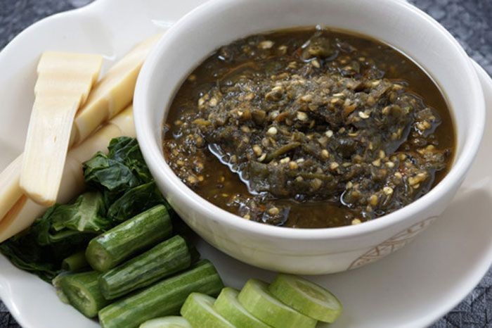 การเสิร์ฟ เสิร์ฟพร้อมถั่วฝักยาว มะเขือ ผักกวางตุ้ง ผักกูด กะหล่ำปลีนึ่งหรือลวก และผักสด เช่น แตงกวา