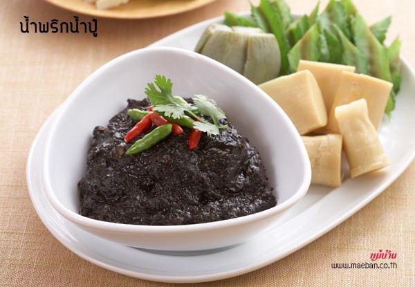 ลักษณะอาหาร ข้นคล้ายน้ำพริกหนุ่ม มีสีดำของน้ำปู๋