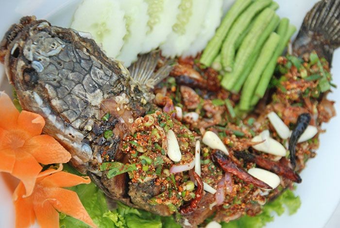 - นำปลาช่อนไปทอดให้เหลือกรอบ แกะเอาเฉพาะเนื้อใส่ในถ้วยผสม