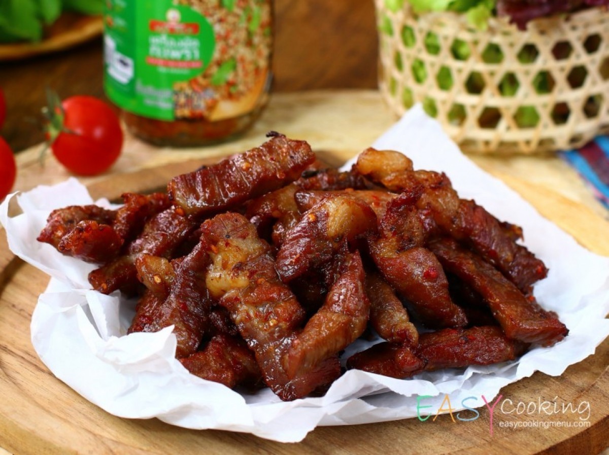 - นำหมูแดดเดียวไปทอดด้วยน้ำมันพืชให้สุก