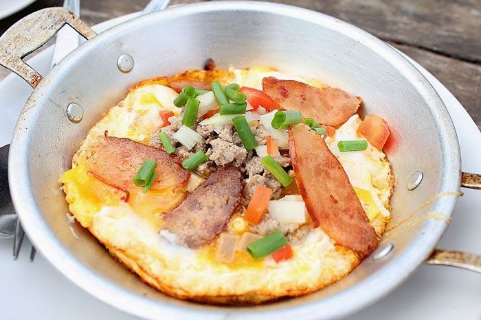7. ตักหมูสับรวน กุนเชียง แฮม ไส้กรอก หมูยอ ที่เตรียมไว้ใส่ ใช้ช้อนกดให้จมลงไปในไข่เล็กน้อย