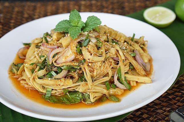 - นำหน่อไม้ที่ต้มแล้วปรุงรสด้วยน้ำมะนาว น้ำปลา น้ำตาลทราย ข้าวคั่ว พริกป่น เคล้าให้เข้ากัน ชิมรส พอรสดี แล้วใส่หอมแดง ต้นหอม ผักชี ผักชีฝรั่ง ใบสะระแหน่ เคล้าให้เข้ากัน จัดใส่จานให้สวยงาม รับประทานกับผักสดต่างๆ เช่น กะหล่ำปลี ถั่วฝักยาว ใบสะระแหน่