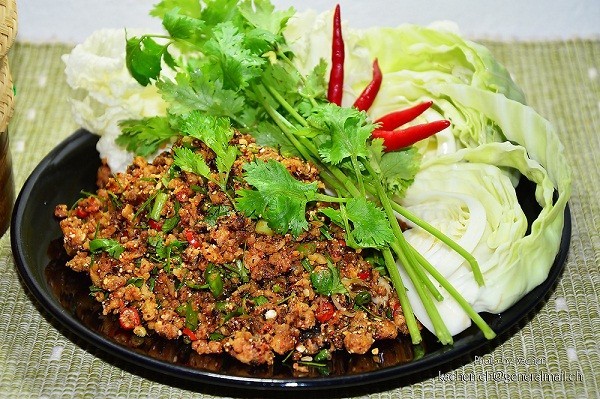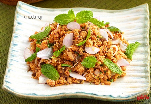 - เคล้าเนื้อปลาดุกกับข้าวคั่ว พริกป่น ข่าหั่นฝอย หอมแดงซอย ใบมะกรูดหั่นฝอย