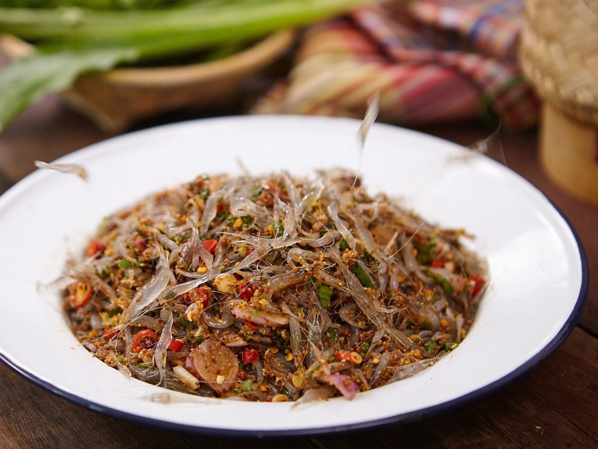 - ใส่กุ้งฝอยลงในอ่างผสม ใส่น้ำมะนาว น้ำปลา ข้าวคั่ว หอมแดง และพริกป่น เคล้าให้เข้ากัน ใส่ผักชีฝรั่งและต้นหอม เคล้าให้เข้ากันทั่ว ตักใส่จานเสิร์ฟ