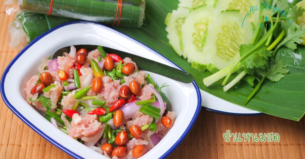 วิธีทำ ยำแหนมสด1.ผสมน้ำมะนาว น้ำปลาดี น้ำตาลทราย พริกขี้หนู คนจนน้ำตาลทรายละลาย2.ผสมแหนม ขิงซอย ต้นหอม ผักชี หอมแดง น้ำปรุงรส เคล้าให้เข้ากัน ชิมรสพอรสดีแล้วตักใส่จานโรยด้วยถั่วลิสงคั่ว