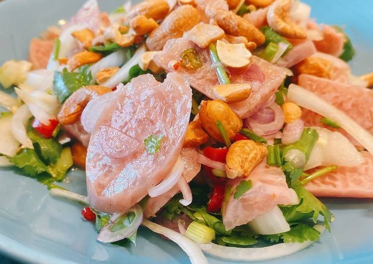 - ผสมแหนม ขิงซอย ต้นหอม ผักชี หอมแดง น้ำปรุงรส เคล้าให้เข้ากัน ชิมรสพอรสดีแล้วตักใส่จานโรยด้วยถั่วลิสงคั่วและพริกชี้ฟ้าทอดให้สวยงาม