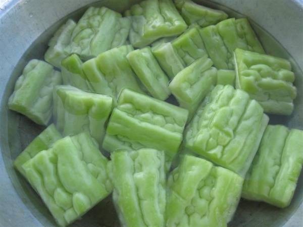 1.นำมะระจีนมาหั่นเป็นชิ้นๆ ใช้ช้อนควักไส้และขูดส่วนที่ขาวๆ ออก แช่น้ำเกลือทิ้งไว้ประมาณ 10 นาที แล้วจึงนำมาล้างด้วยน้ำสะอาดอีกรอบ พักไว้