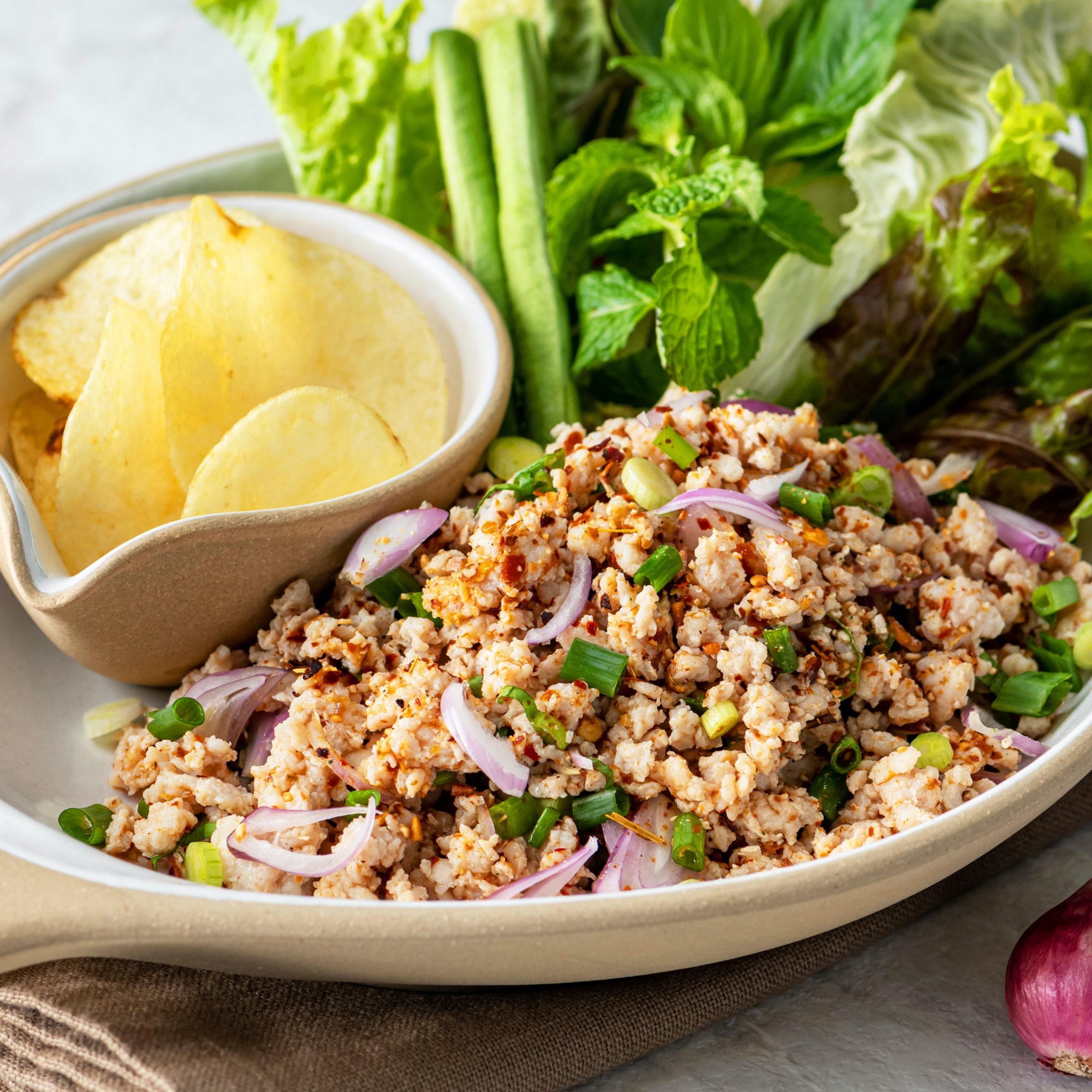 - ผสมไก่รวน น้ำปรุงรส พริกป่น ข้าวคั่ว คลุกให้เข้ากันจึงใส่ผักชี ต้นหอม ผักชีฝรั่ง หอมแดง ใบสะระแหน่ เคล้าให้เข้ากัน จัดใส่จานให้สวยงาม รับประทานกับผักสดต่างๆ เช่น ถัวฝักยาว กะหล่ำปลี ผักกาดขาวใบโหระพา ฯลฯ