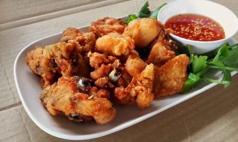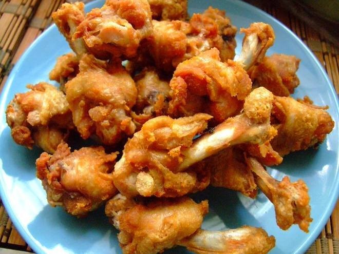 - น่องไก่ติดสะโพกสองชิ้น ล้างให้สะอาด นำมาสับทั้งกระดูก คลุกด้วยเกลือ 2 ช้อนชา ผงรสไก่ 1 ช้อนชา ซอสปรุงรส 1 ช้อนชา หมักไว้ 15 นาที ผึ่งพัดลมให้แห้งๆ