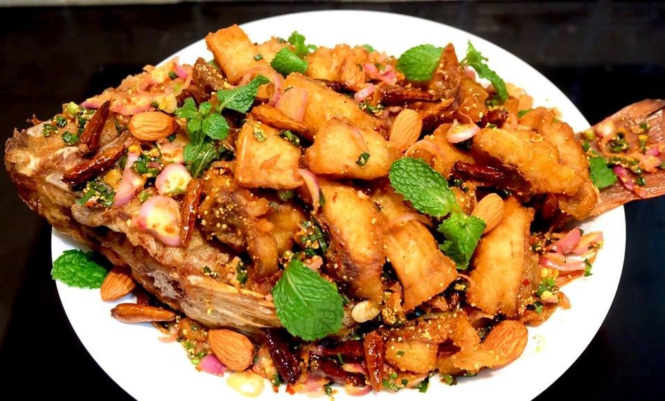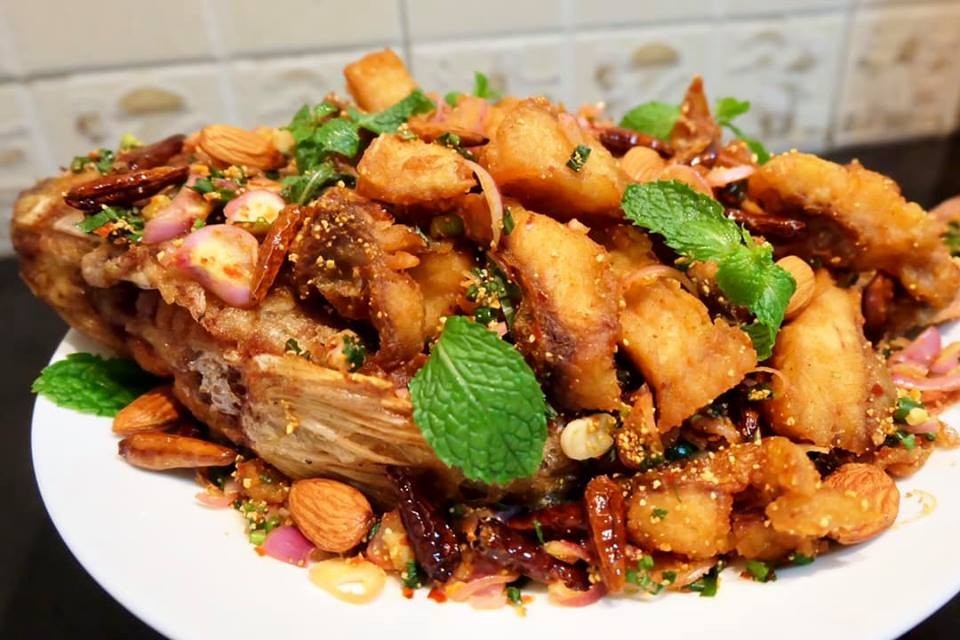3.เวลาเสิร์ฟ จัดปลาทอดในใส่จาน แล้วราดด้วยน้ำปรุง โรยด้วยใบสะระแหน่