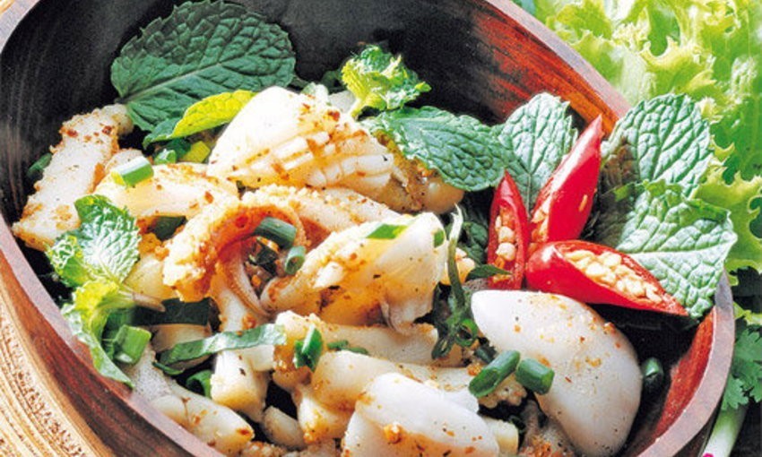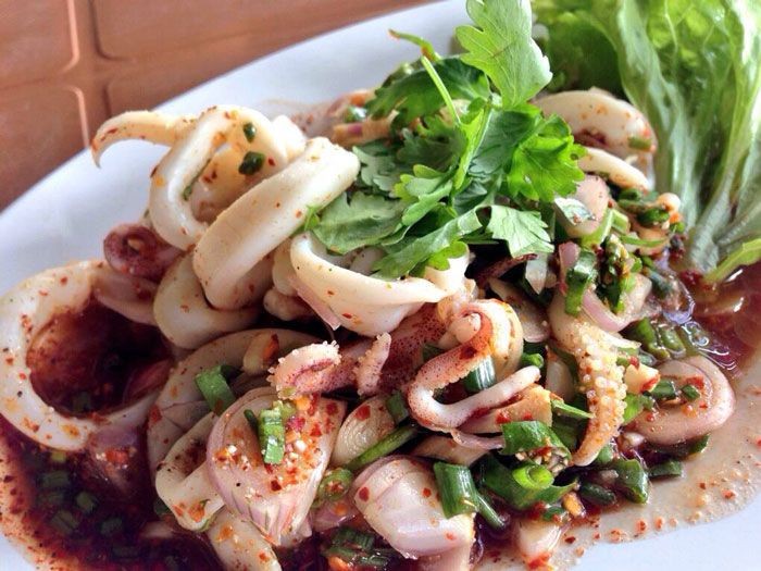 ล้างทำความสะอาดหมึกให้เรียบร้อย แล้วหั่นเป็นชิ้นใหญ่ เตรียมไว้ให้พร้อม จากนั้นนำหม้อใส่น้ำเปล่า ตั้งไฟจนเดือดพล่าน ใส่หมึกลงไปลวกแค่พอสุก ตักขึ้นพักไว้ให้สะเด็ดน้ำ แล้วนำมาใส่ชามผสม ปรุงรสใส่น้ำปลา น้ำมะนาว ข้าวคั่ว และพริกป่นลงไป คลุกเคล้าให้เข้ากัน ใส่ผักชี ต้นหอม และผักชีฝรั่ง คลุกเคล้าอีกครั้ง ก็ตักใส่จาน โรยหน้าด้วยใบสะระแหน่ให้หอมๆ กินเคียงกับผักสดก็ยิ่งเข้ากัน