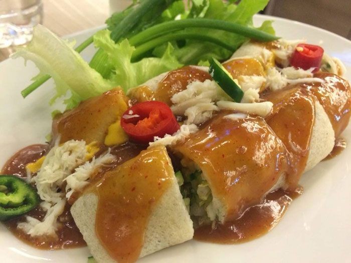 4. เสริฟ ปอเปี๊ยะตัดให้ได้ 4 คำ ห่อไว้ด้วยใบตอง ถ้วยจิ้มราด ถ้วยแยกน้ำบ๊วย มัสตาร์ด พริกแดงโขลกละเอียด ต้นหอม