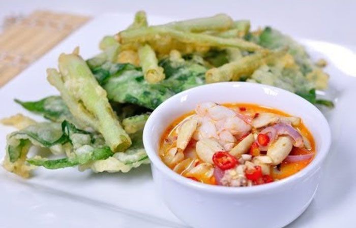 4. จากนั้นทำน้ำยำโดยใส่น้ำปลาลงไปในถ้วย ตามด้วยน้ำตาลทราย น้ำมะนาว หอมแดงซอย และพริกแดงสับหยาบ คนให้เข้ากัน ตักใส่ถ้วยที่เตรียมไว้ โรยด้วยเม็ดมะม่วงหิมพานต์คั่ว ถั่วลิสงคั่ว และผักชี เสิร์ฟพร้อมกับผักบุ้งชุบแป้งทอดที่เตรียมไว้