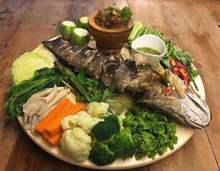 วิธีทำ ปลาช่อนนึ่งแจ่ว ปลาช่อนขอดเกล็ดล้างให้สะอาด เตรียมจานสำหรับใส่ปลาได้ทั้งตัว จัดผักต่างๆไว้ วางตัวปลาลงในจาน จากนั้นนำไปนึ่งจนสุก