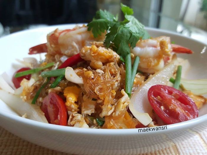 วิธีทำ ผัดวุ้นเส้นใส่ไข่ เจียวกระเทียมให้หอม ใส่กุ้งลงไปผัดประมาณ1นาที ตอกไข่ลงไป ตามด้วยหอมใหญ่ ผัดให้เข้ากัน