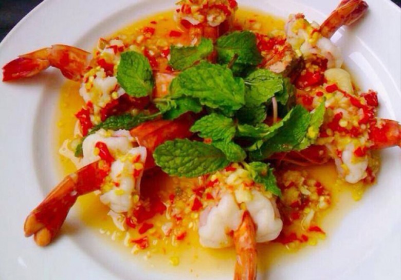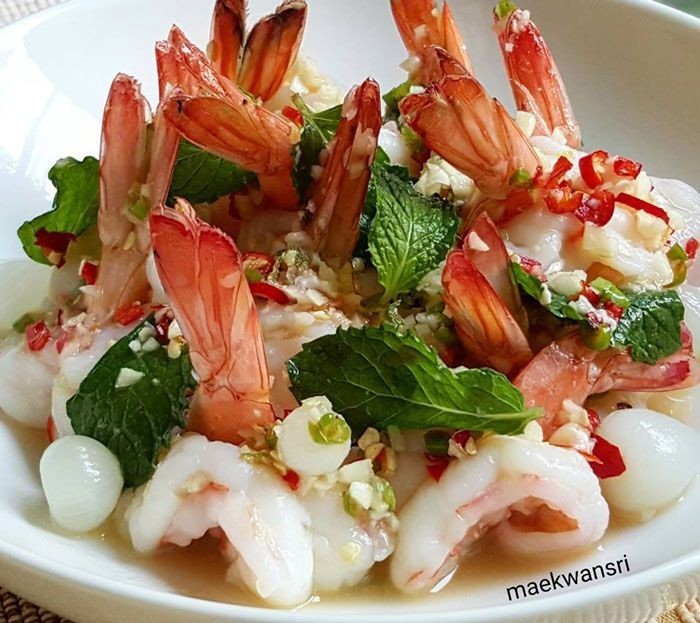3.ยกกุ้งลงเทน้ำออกหรือจะเก็บไว้ก็ได้ ราดน้ำยำ (ข้อ1)ลงไปจะนำ โรยหน้าด้วยใบสาระแหน่,กระเทียมโทนดอง