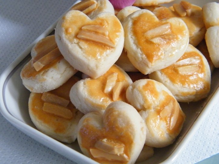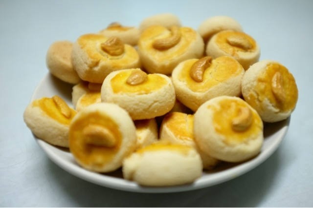 - ทาด้านหน้าด้วยไข่แดงให้ทั่ว วางทับด้วยเม็ดมะม่วงหิมพานต์ผ่าครึ่งซีก ทำจนหมด เรียงใส่ถาด อบไฟ 400 องศาฟาเรนไฮต์ จนสุกเหลือง