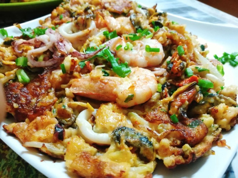 3. ใส่น้ำมันลงในกระทะ กลิ้งให้น้ำมันเคลือบทั่วๆ กระทะ ใส่แป้งที่ผสมกับซีฟู้ดแล้วลงไปทอด จนแป้งเริ่มสุก