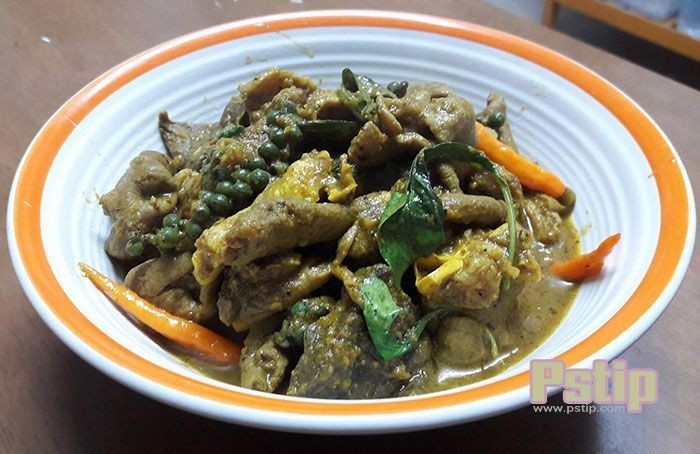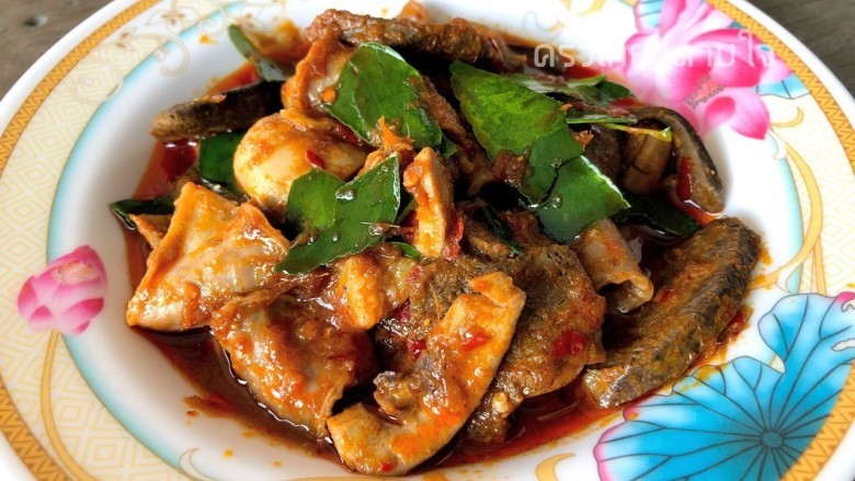 3.นำกระทะขึ้นตั้งไฟ ใส่เครื่องแกงที่ละลายไว้แล้วลงไป ใส่กระเทียมบุบที่เหลือและผัดพอหอม จึงใส่ไส้หมูต้มสุกลงไปผัดคลุกเคล้ากับเครื่องแกงจนเข้ากันดี ใส่น้ำต้มไส้หมูในข้อ1 ลงไป พอขลุกขลิก