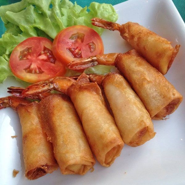 3. ตัดแป้งปอเปี๊ยะเป็นสองส่วน แล้วจึงตัดเป็นรูปสี่เหลี่ยมผืนผ้า วางกุ้งลงตรงกลางแผ่นแป้งม้วนให้หางกุ้งโผล่ออกมา ติดด้วยแป้งเปียกให้สนิท