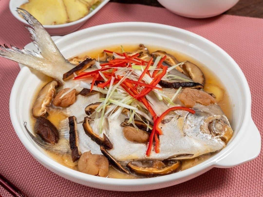 - นำปลาใส่จานที่จะนึ่ง ใส่น้ำซุป น้ำมันหอย ซอสปรุงรส ซีอิ๊วขาว น้ำตาลทราย บ๊วยดองบี้ให้แตก ราดบนตัวปลา แล้วนำไปนึ่งในลังถึง
