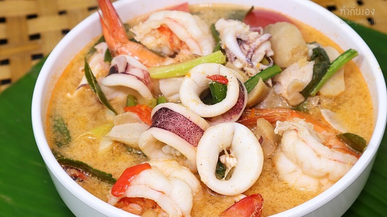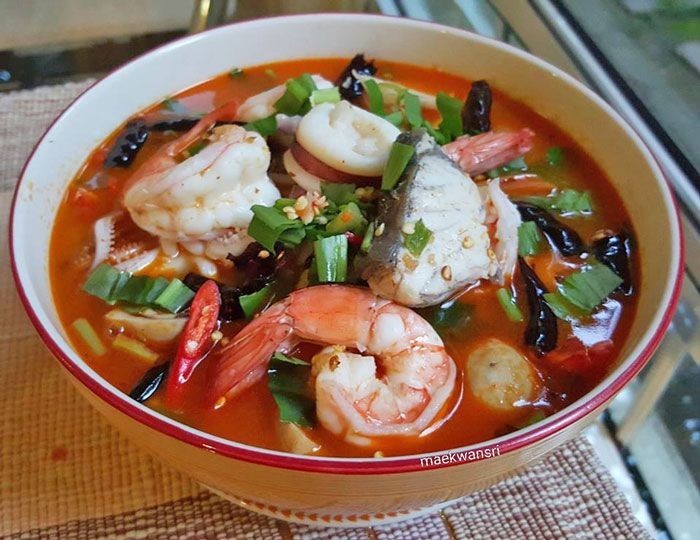 2.ใส่น้ำพริกเผา มันกุ้ง ลงไป ต้มให้เดือด ปรุงรสด้วย น้ำมะนาว/น้ำปลา /น้ำตาล ตามชอบ ใส่เห็ดฟาง,ปลาหมึกลงไป รอเดือดอีกครั้งใส่เนื้อปลา ลงไปห้ามคน เมื่อเริ่มเดือดอีกให้ใส่กุ้งลงประมาณ2นาที ปิดไฟ