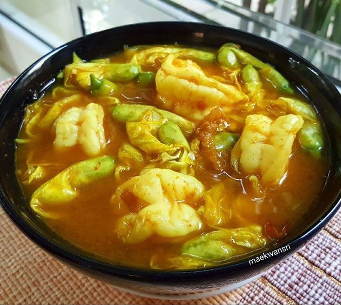 - ล้างกุ้ง หักหัว ปอกเปลือก (เก็บหัวและเปลือกไว้นำไปต้มทำน้ำแกง) ผ่าหลัง ดึงเส้นดำออก แบ่งกุ้งไปต้ม 50 กรัม ส่วนที่เหลือใส่แกง