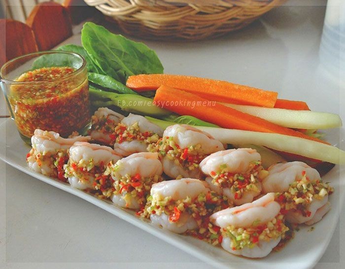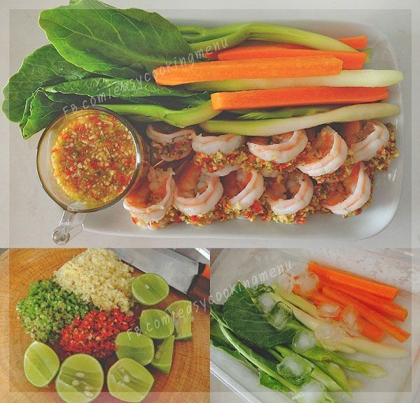 2. ทำน้ำจิ้ม โดยนำน้ำมะนาว น้ำปลา และน้ำตาลทราย คนผสมให้น้ำตาลละลาย จากนั้นชิมรส ถ้าจัดเกินไปจะเติมน้ำซุปจากการลวกกุ้งนิดหน่อยก็ได้ค่ะเมื่อได้รสที่ชอบแล้ว ใส่กระเทียมรากผักชี และพริกขี้หนูสับตามลงไป เสิร์ฟคู่กับก้านคะน้า และแครรอทแช่เย็น