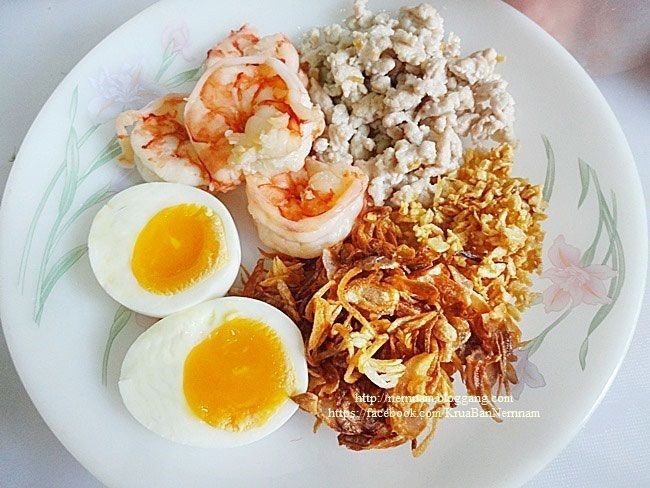 เตรียมกุ้งสดลวกสุก หมูสับรวน กระเทียมเจียว หอมเจียว และไข่ต้มยางมะตูม