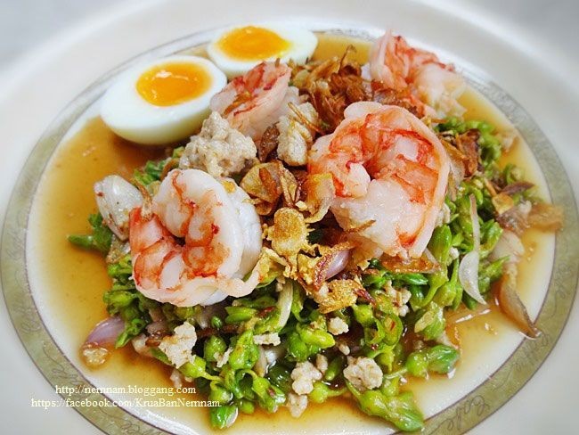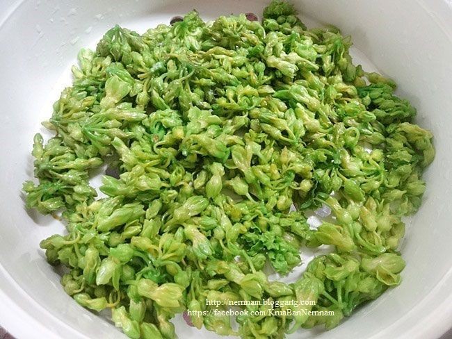 ลวกดอกขจรในน้ำเดือด ตักขึ้นใส่ลงแช่ในน้ำเย็น จากนั้นตักขึ้นพักให้สะเด็ดน้ำ เตรียมไว้