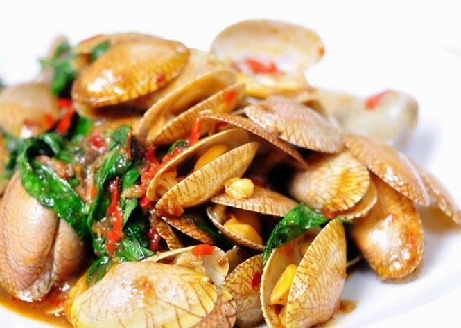 3. ใส่หอยลายที่ลวกเตรียมไว้ลงไปผัดให้เข้ากันเบา ๆ จากนั้นใส่ใบโหระพาลงผัดพอเข้ากัน ปิดไฟ ตักใส่จาน พร้อมรับประทาน