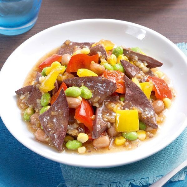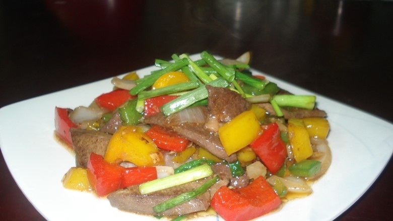3. พอตับใกล้สุก ใส่พริกหวาน ถั่วลิสง ถั่วลันเตา และเมล็ดข้าวโพดลงไปผัด พอพริกหวานสุก ตักใส่จาน โรยพริกไทยป่น จัดเสิร์ฟ