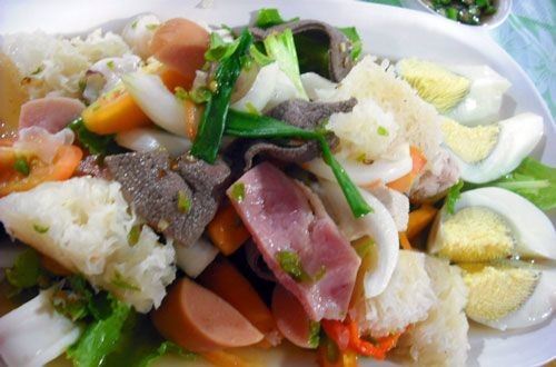 - นำเครื่องทุกอย่าง ยกเว้น ผักชี พริกแดง มาคลุกกับน้ำยำที่ปรุงไว้ให้เข้ากัน เมื่อรสดีแล้วจัดใส่จาน แต่งหน้าด้วยผักชี พริกแดง กระเทียมเจียว