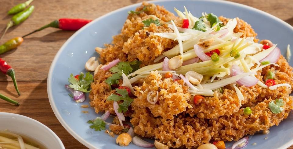 - เลาะก้างกลางของปลาดุกย่างออกแล้วสับละเอียด ผึ่งให้แห้ง ผสมกับเกล็ดขนมปัง